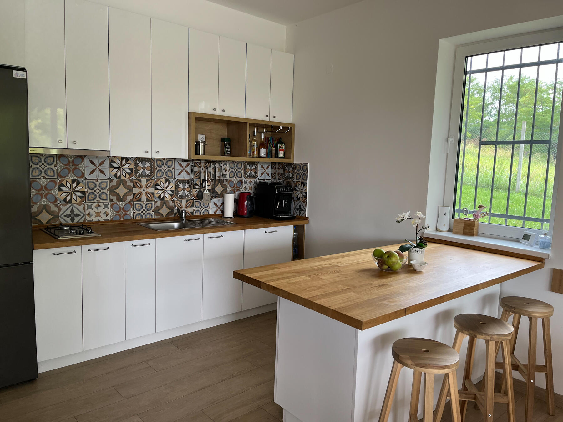 Gostima je na raspolaganju i potpuno opremljena kuća.Na donjoj etaži se nalazi dnevna soba i trpezarija, kuhinja i kupatilo sa tuš kabinom. U kuhinji se nalazi espresso aparat, kafa, svi začini i ulje.Na spratu se nalaze 3 sobe, kupatilo sa tuš kabinom, kao i velika terasa sa koje se pruža predivan pogled na ceo Novi Sad.